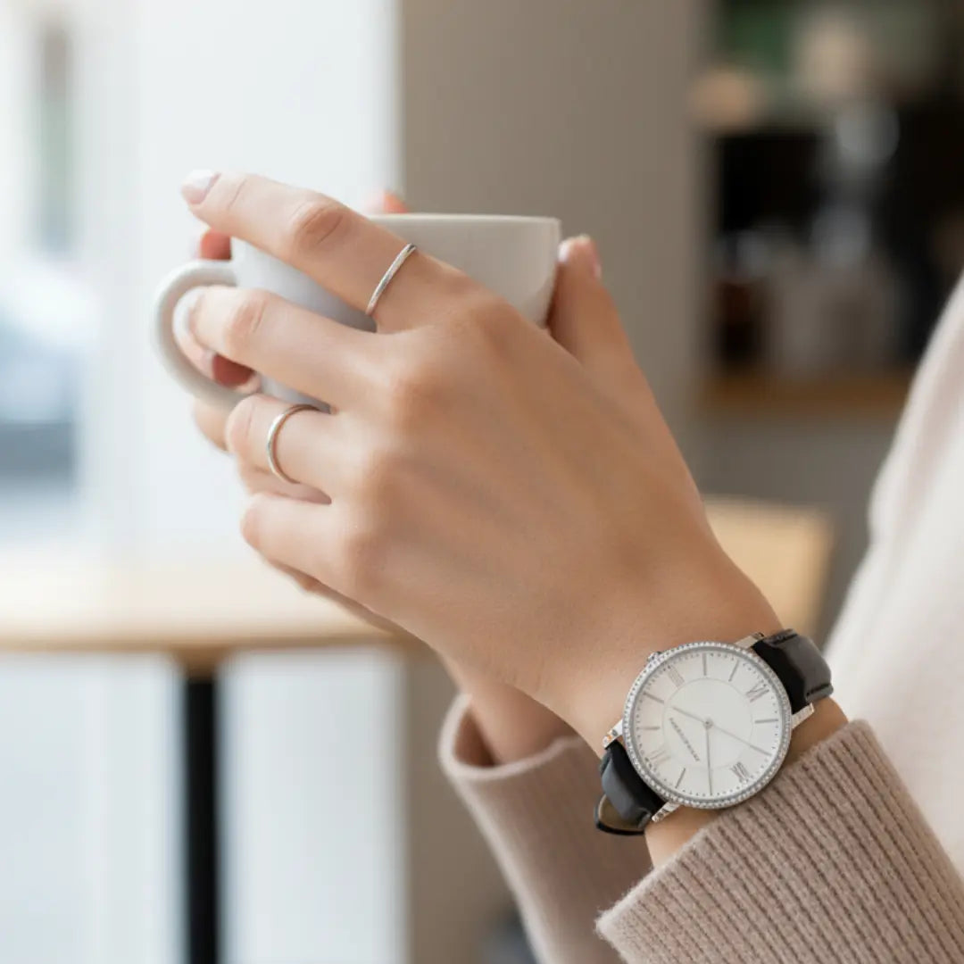 Com mostrador prateado delicado, pulseira em couro preto macio e aro sutilmente cravejado, ele traduz a essência da mulher moderna — confiante, refinada e com olhar apurado para o estilo.